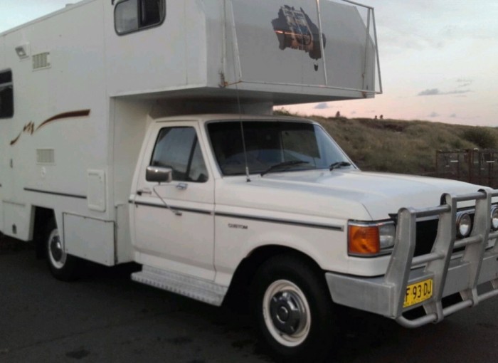 1986 Ford F250 Motorhome White, with bullbar NED KELLY FRONT & REAR DECALS and stripe side decals. Timber cupboards and 80's-90's curtains Table converts to a second bed Sleeps 4 comfortably. Fridge, oven, toilet, shower etc A nice looking 80's camper / motorhome / caravan